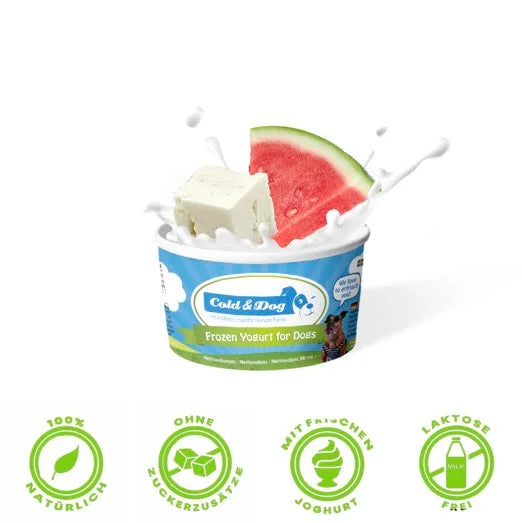 Der ultimative Frischekick. Wer kennt diesen Moment nicht wenn Deine Fellnase herzhaft und mit viel Freude in eine kalte Wassermelone beißt. Ab jetzt kann diese auch direkt aus dem Eisbecher genossen werden. Das leckere Hundeeis von Cold&Dog überzeugt mit gesunder Rezeptur, ausgesuchten Zutaten und liebevoller Handarbeit. Die erfrischende Sorte Wassermelonen Spritz besteht aus laktosefreiem Joghurt, Bio-Agavendicksaft, Wassermelone (Bio), Feta sowie gesunden Ölen. Das erste Berliner Hundeeis verzichtet auf Zuckerzusätze und Konservierungsstoffe und eignet sich als ein gesunder Hundesnack für zwischendurch.